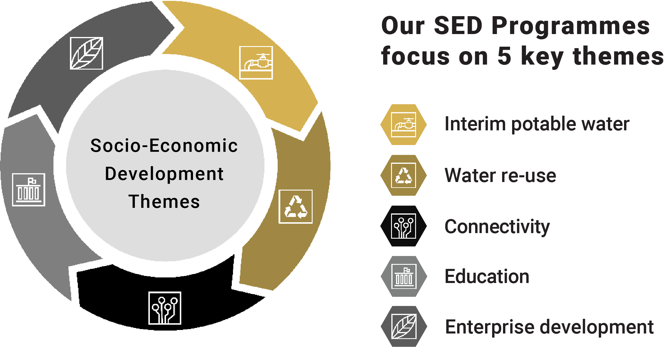 Infrastructure programmes such as the OMMP cannot be completed without considering the socio-economic development (SED) impact on communities and the need for secondary economies to be established. That is why we are taking a holistic approach to SED and our programmes will focus on five key themes: Potable Water, Water Re-Use, Enterprise Development, Education and Connectivity, to develop skills, create jobs and change behaviour.