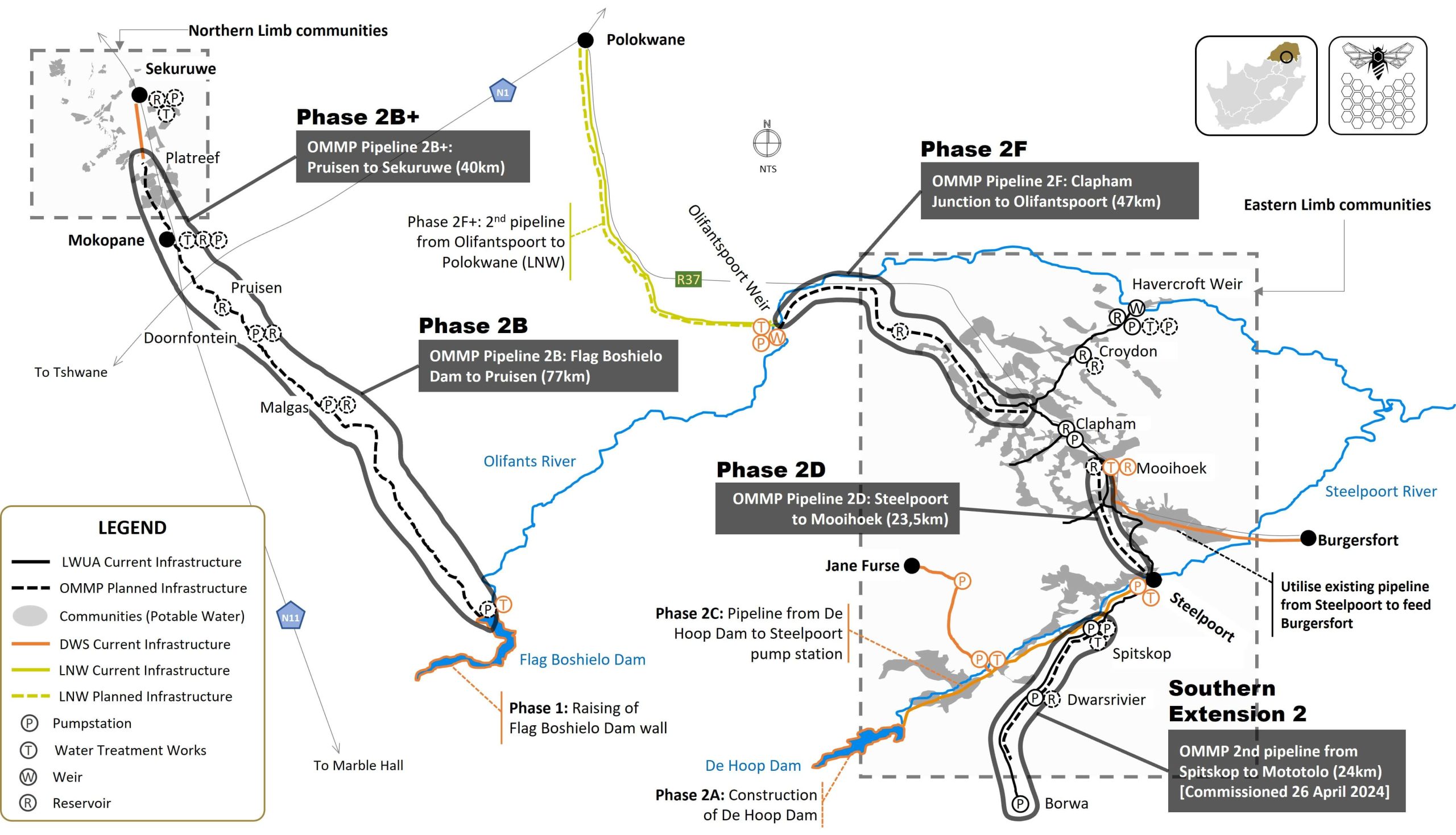 The OMMP’s infrastructure will supply targeted communities and commercial water users in Sekhukhune District Municipality and Mogalakwena Local Municipality, while optimising the utilisation of existing infrastructure and water supply from two dams (the De Hoop and Flag Boshielo Dams) in the Middle Olifants catchment. The OMMP will also enhance the water supply to the Polokwane Local Municipality, which faces a 30 Ml/day water shortage.